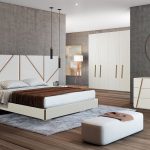 Intérieur, extérieur de placard, aggloméré mélaminé. Intérieur, extérieur chevet, commode, fond des tiroirs, base du lit, têtes de lit, détails déco MDF. Lit pour literie 160×200 cm. Charnières et coulisses invisibles.